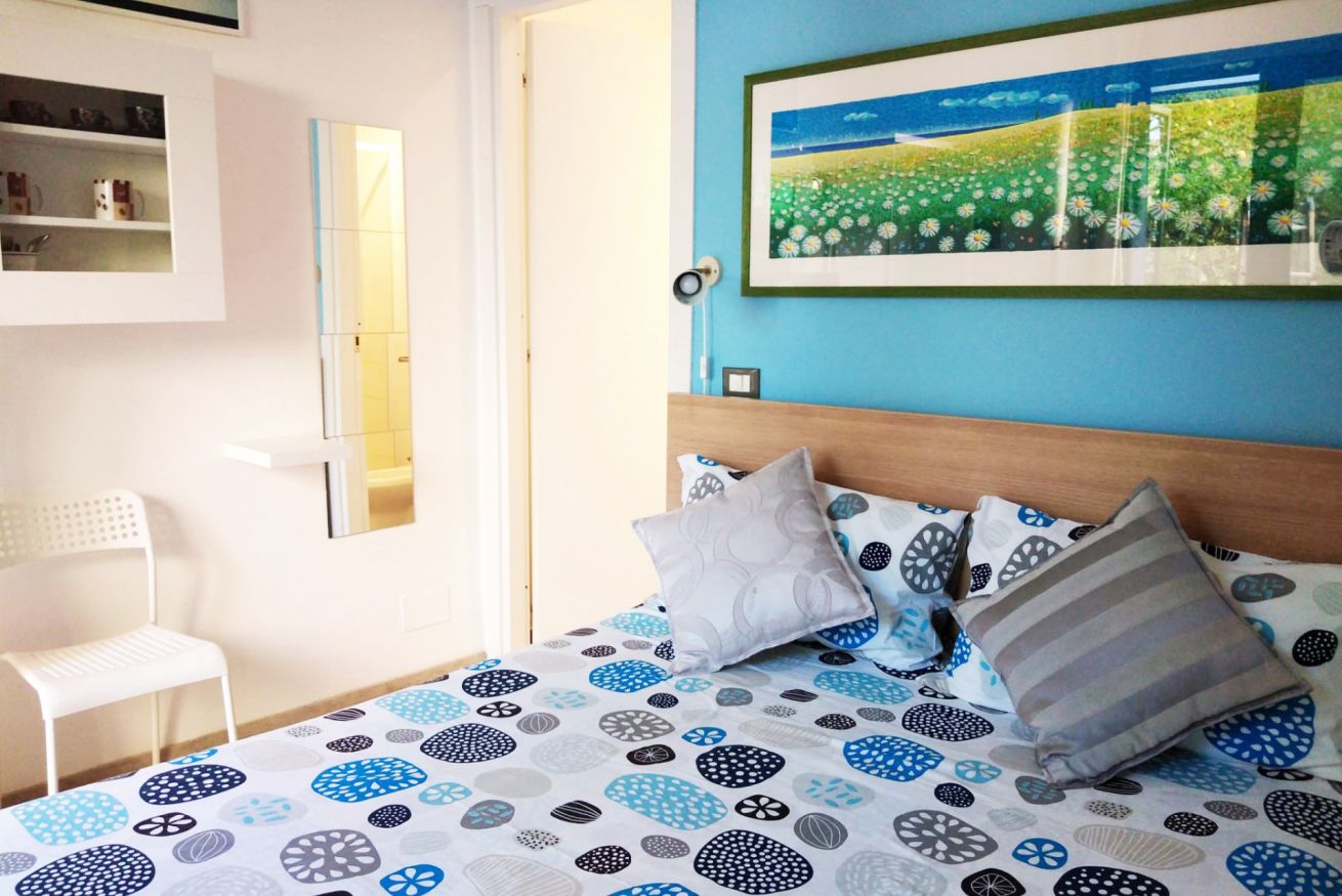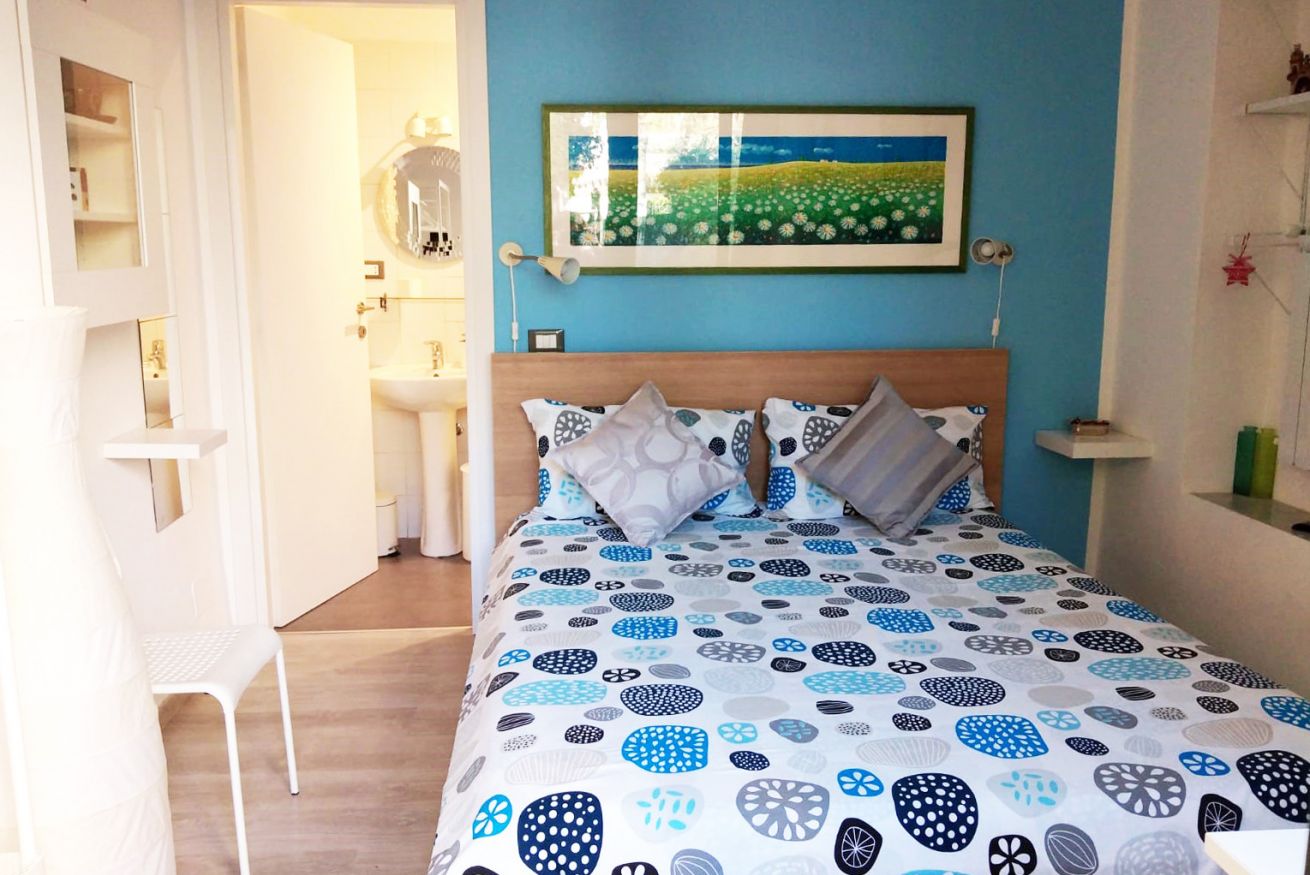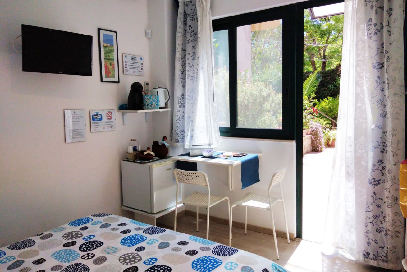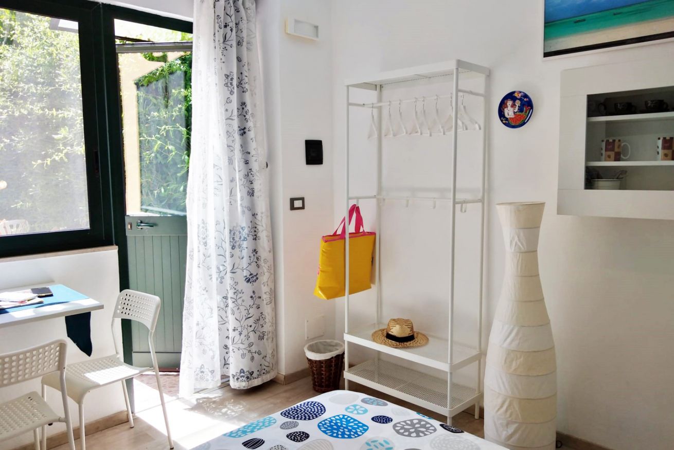Camera con letto matrimoniale e bagno privato con doccia all'interno, dotata di ogni comfort: wi-fi gratuito, aria condizionata, tv, mini frigo, macchina del caffè con cialde, bollitore, guardaroba, biancheria da letto e da bagno, stendino. All'esterno è presente un angolo cottura, microonde e un grande tavolo con sedie a disposizione dei nostri ospiti. 2 biciclette in dotazione per l'intero soggiorno.